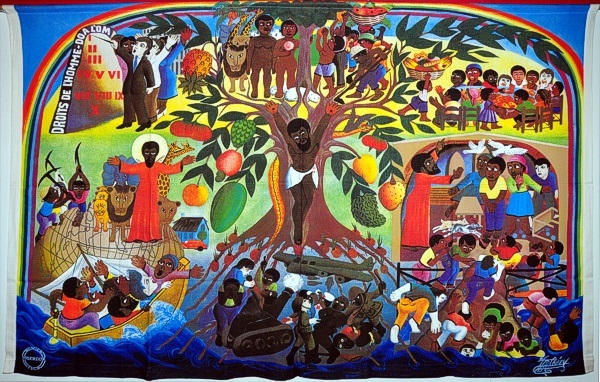 U ziet hier de afbeelding van een zogenaamde hongerdoek uit Haiti. Hij heet ‘aan de vruchten ken je de boom’.