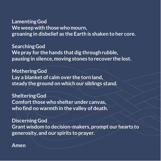 Gebed bij de aardbeving On 11 februari 2023 door kruijswijkjanseninGeen categorie Ruth Harvey, Leader van de Iona Community Delen: Klik om te delen op X (Opent in een nieuw venster) X Klik om te delen op Facebook (Opent in een nieuw venster) Facebook Vind-ik-leuk Aan het laden... Gerelateerd
