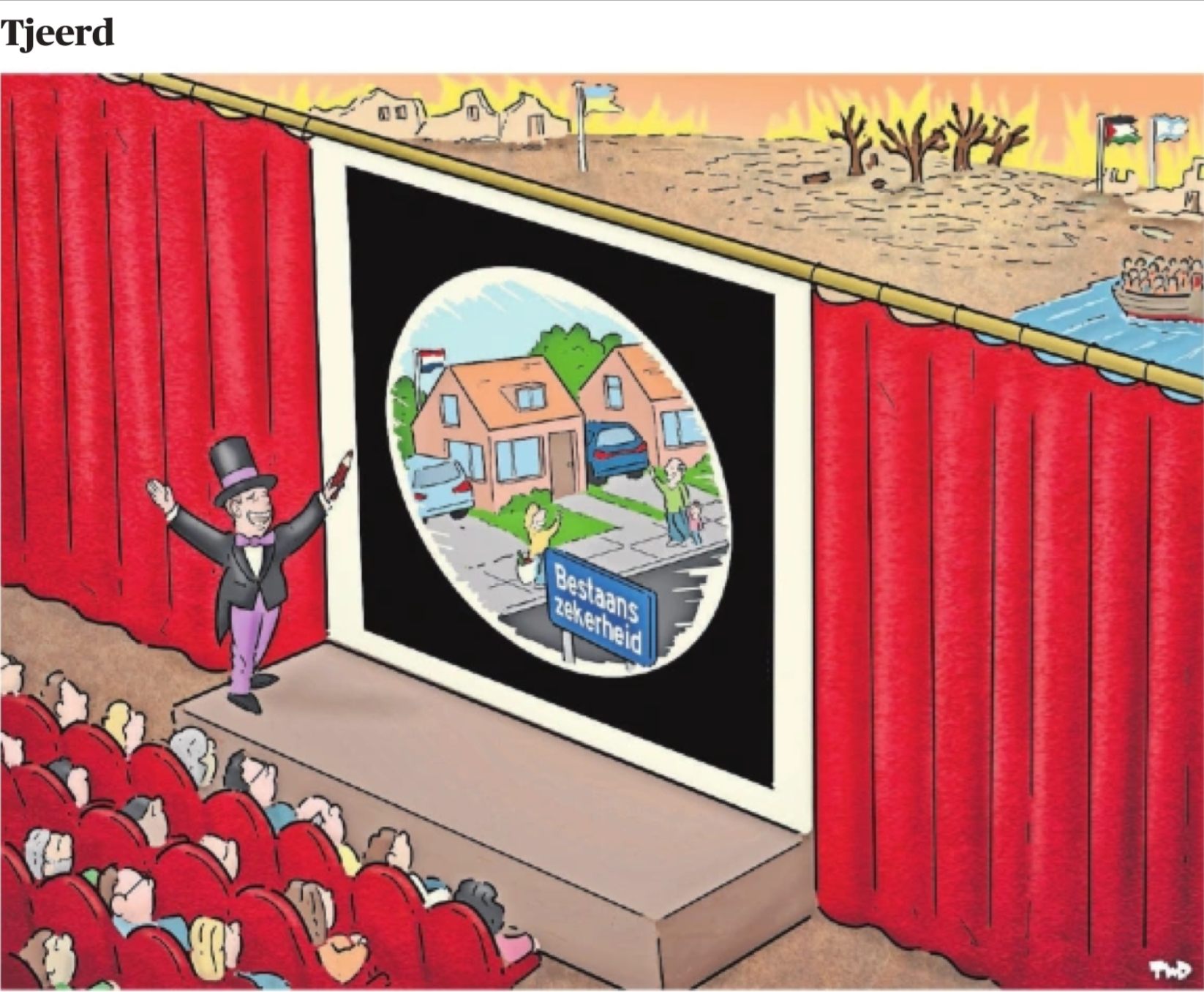 Maar dan… achter het doek zie je rechts bootvluchtelingen, dan de strijd tussen Palestijn en Israëli,
